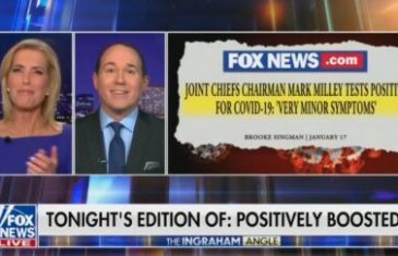 Read moreLaura Ingraham took particular delight in the fact that Gen. Mark Milley, the chair of the Joint Chiefs of Staff, tested positive for Covid-19. In June, the Fox News host accused Milley of spreading “far-left Marxist racist ideology” in the U.S. military. During Monday’s show, Ingraham introduced a recurring segment with Raymond Arroyo called “Positively Boosted,” during which the two highlight Covid-positive cases […]